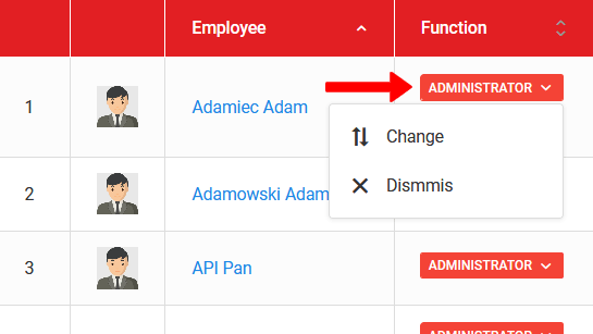 Um die Rolle eines Mitarbeiters zu löschen oder zu ändern, klicken Sie auf die farbigen Kacheln neben dem Namen des Mitarbeiters. Beim Klicken sehen Sie zwei Optionen zur Auswahl: "entlassen" oder "ändern". Entlassen bedeutet, dass dem Benutzer die Rolle entzogen wird, und durch Klicken auf Ändern können Sie die aktuelle Rolle bearbeiten.
