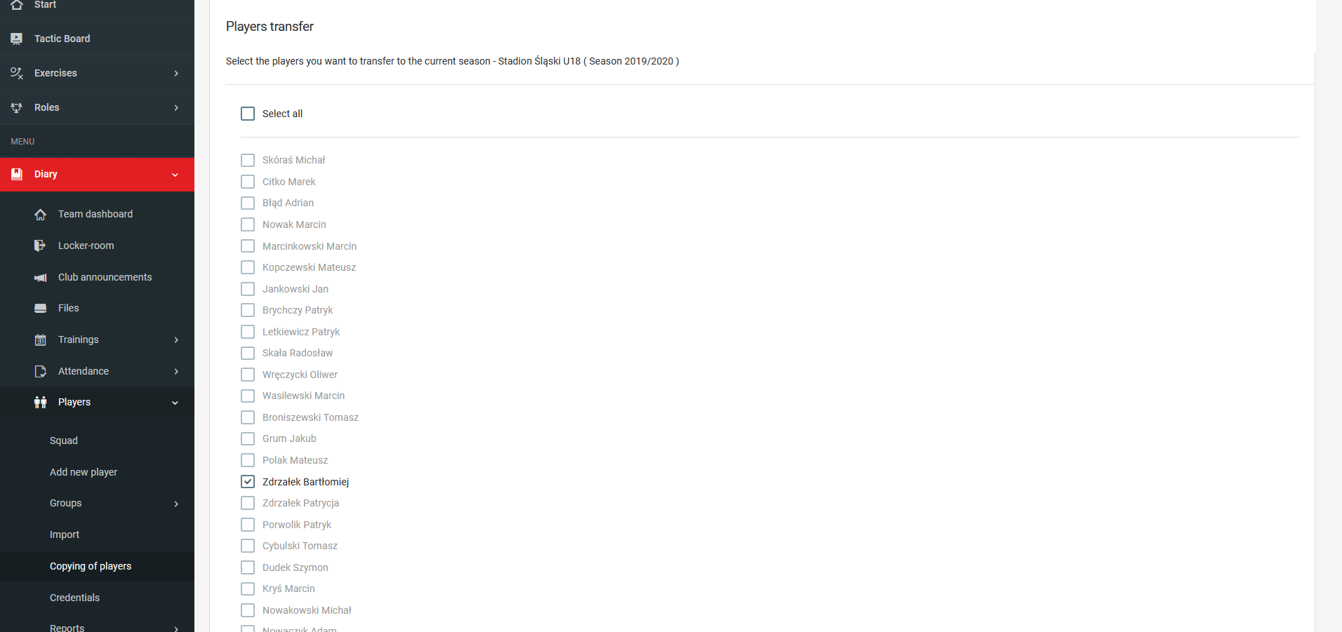 Nach dem Erstellen der nächsten Saison in Ihrem Team werden Sie beim Aufrufen des Reiters Tagebuch Spieler Kader das Fehlen einer Spielerliste bemerken. Diese Situation ist beabsichtigt und völlig normal. Dank der Funktion "Spieler aus der vorherigen Saison kopieren" werden Sie in der neuen Saison nur Spieler haben, die tatsächlich in der neuen Saison in Ihrem Team geblieben sind.
