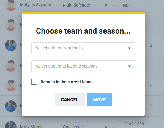 Bitte beachten Sie jedoch, dass die Daten, die untrennbar mit seinem vorherigen Team verbunden sind, d.h. Anwesenheit, Spielstatistiken, Trainingsergebnisse oder Beiträge, nicht mit dem Spieler in das neue Team übertragen werden.