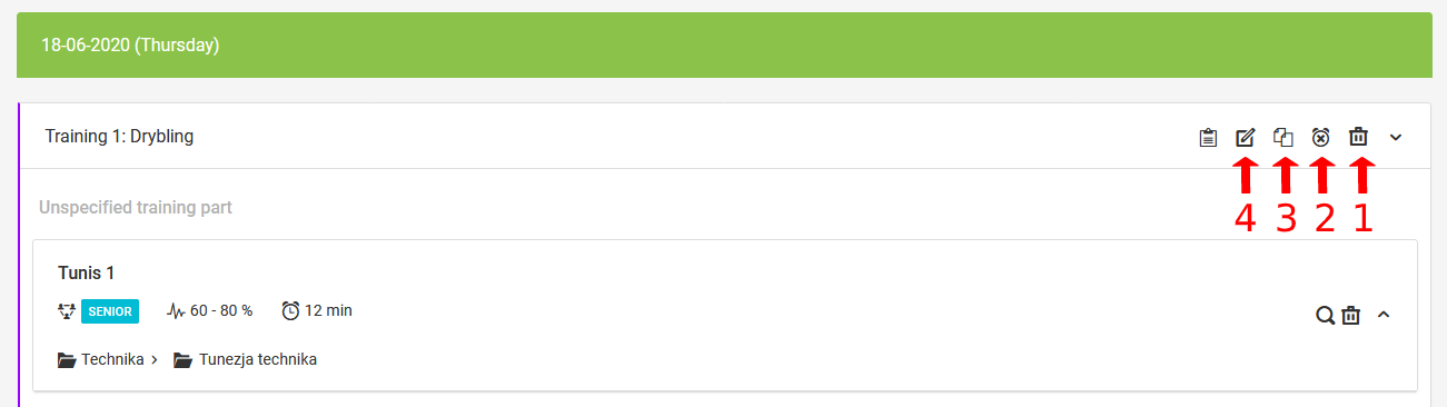 Über jeder Trainingseinheit befinden sich in der oberen rechten Ecke zusätzliche Optionen, die Sie jederzeit nutzen können. Die erste (1) ist das vollständige Löschen des Trainings, die zweite (2) ist das Absagen des Trainings. Wenn Sie auf dieses Symbol klicken, erscheint ein Popup, in dem Sie den Grund für die Absage des Trainings angeben und die Option zum Senden einer Benachrichtigung an die Teilnehmer aktivieren können. Die dritte Position (3) ist das Kopieren des Trainings. Dies ermöglicht es Ihnen, das Training nicht nur von Tag zu Tag, sondern auch zwischen den Teams, die Sie leiten, zu kopieren. Das vierte (4) Symbol öffnet das Fenster zur Bearbeitung des Trainings.