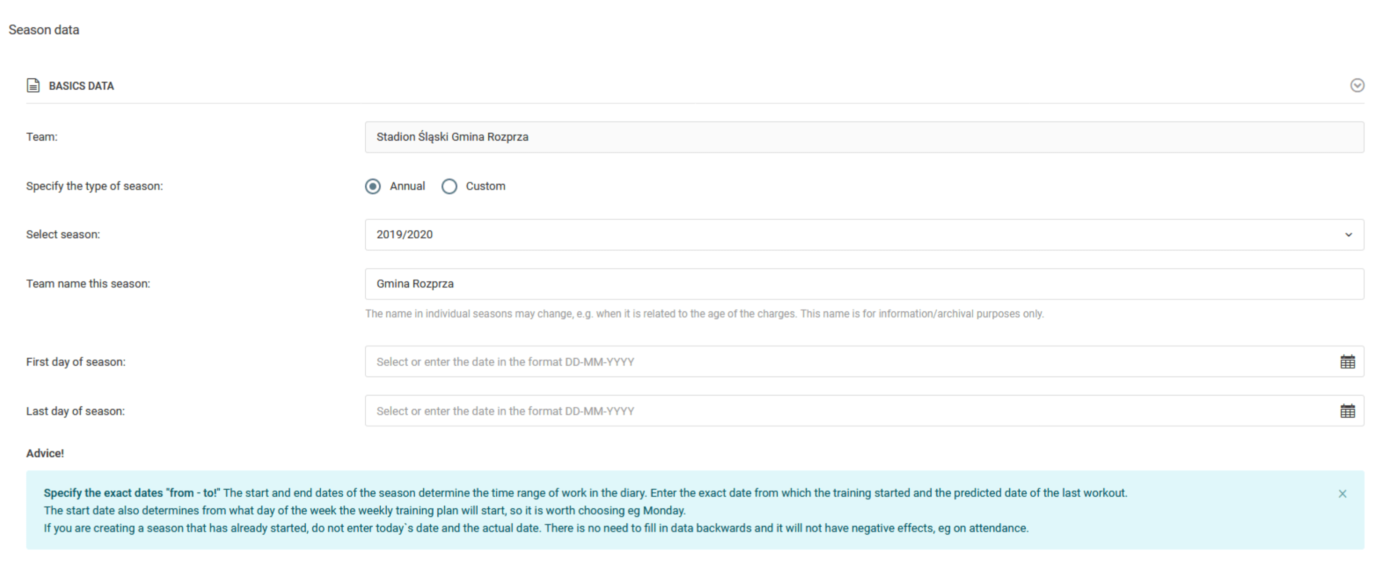 To create a season in the system, click on the left menu button: diary seasons add season. Then you`ll see a new season creation form. There you will find a few fields to complete, starting with a selection from the list of the season e.g. 2020/2021, then we set the name of our team for this season and choose the start and end date of the season. We recommend that you create annual seasons, but the system allows you to add shorter seasons called custom seasons in exceptional cases.