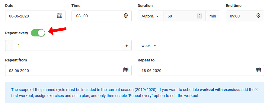 The system gives the possibility to create cyclic training. To do this, in the window of creating/editing a workout, select the "repeat every" button. When you click on it, you will see fields where you can set the interval - the number of repetitions of a given training unit and from when and to when the training unit is to be scheduled.