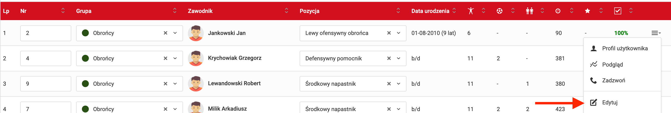 Aby  edytować profil zawodnika, kliknij w pozycję "edytuj" w menu funkcyjnym przy danym graczu. Z tego miejsca będziesz miał możliwość dodania zdjęcia gracza,