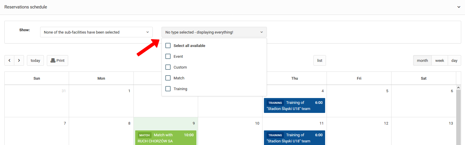 Na visualização de cada sub-instalação, na parte inferior da página, há um cronograma para reservar uma determinada sub-instalação. Acima do calendário, você tem a possibilidade de filtrar um local específico e um tipo específico de evento para aumentar a legibilidade do calendário em caso de alta ocupação.